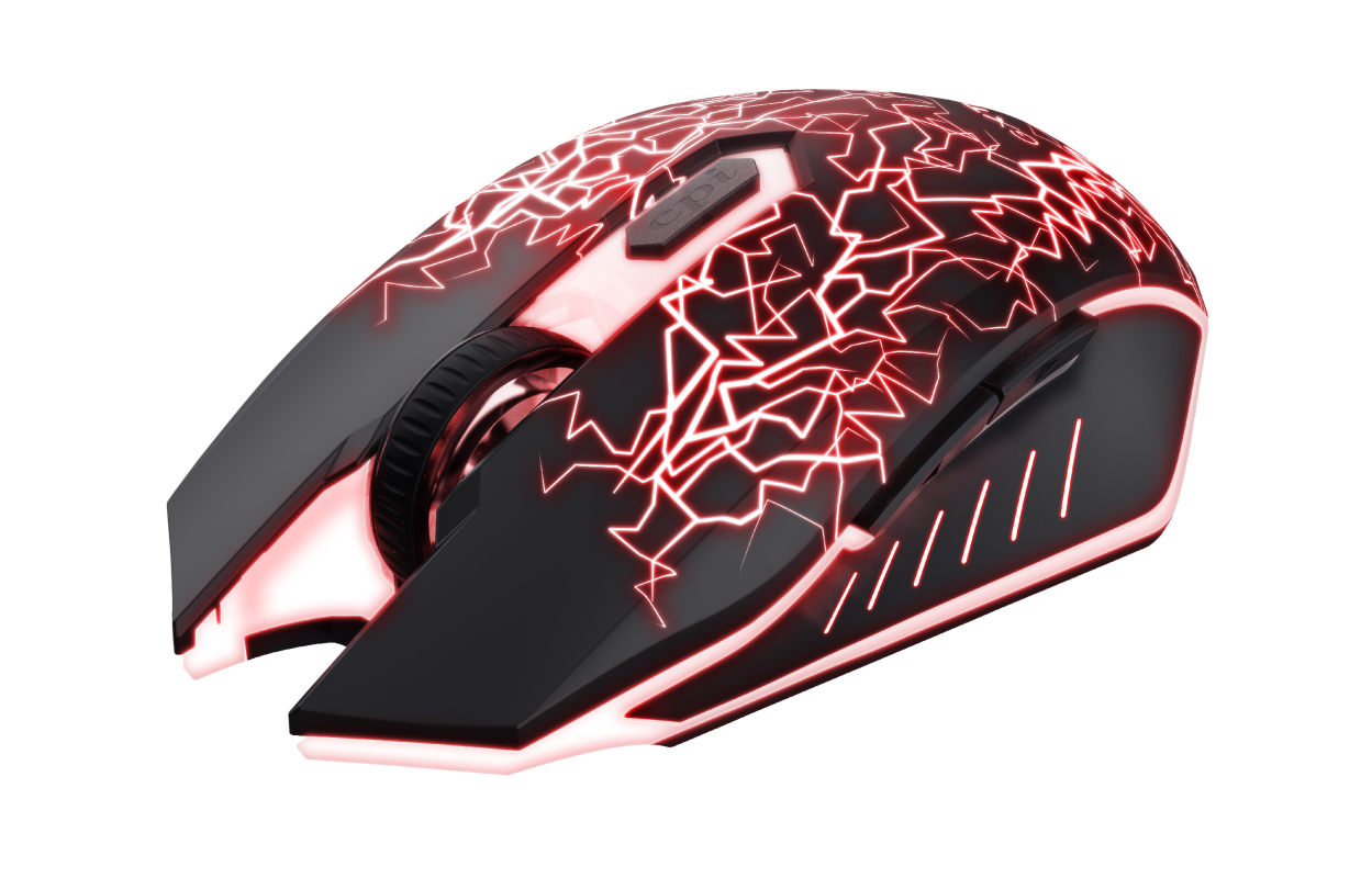 Trust 24750. Tecnologia de detecção de movimento: Óptico, Interface de dispositivo: RF Wireless, Resolução do movimento: 2000 DPI, Tipo de botões: Botões premidos, Número de botões: 6, Tipo de scroll (deslocamento): Roda. Cor de iluminação: Multi. Fonte de alimentação: Baterias. Cor do produto: Preto