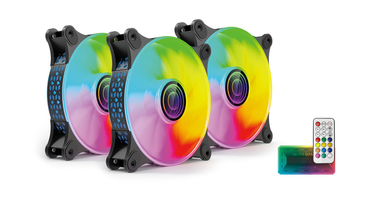 Mars Gaming MF-3DKIT. Tipo: Ventoinha, Diâmetro do ventilador: 12 cm, Velocidade de rotação (máx.): 1100 RPM, Nível de ruído (velocidade alta): 14 dB, Tipo de rolamento: Hidráulico. Voltagem: 12 V. Cor do produto: Preto